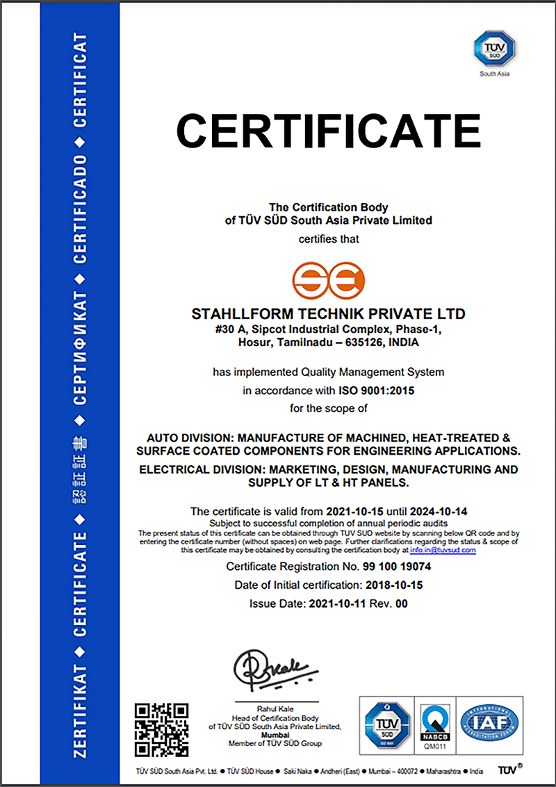 ISO 9001 : 2015 Certified Organization. Certified by TUV SUD South Asia Pvt Ltd. Certification renewed on 15th Oct 2021. Valid Till 14th Oct 2024.