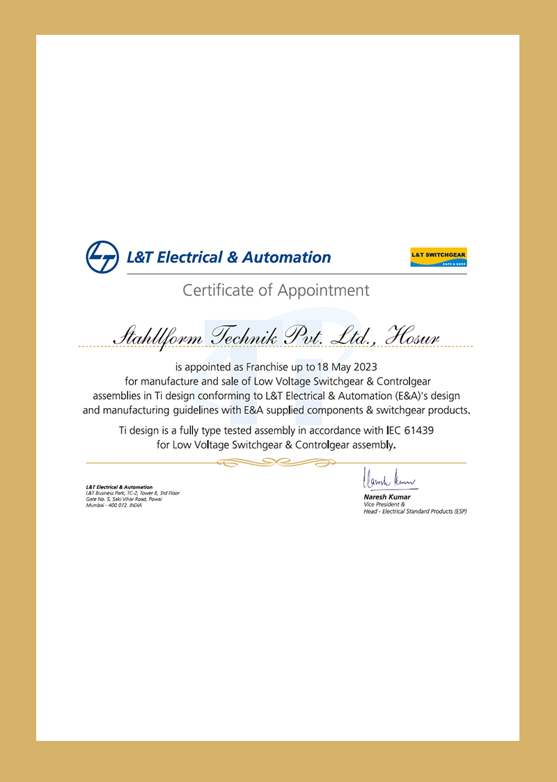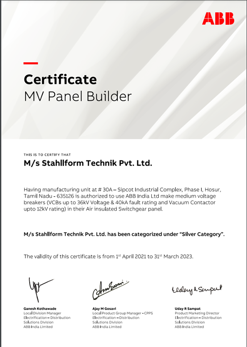 Licensed Partnership of ABB Ltd for Manufacturing of HT Switch boards up to 33KV as per IEC 62271-200.